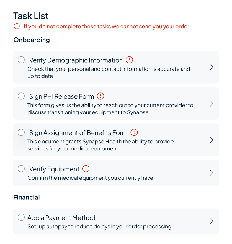 Yes—Please log into the patient portal and complete your intake forms. This helps prevent delays in getting your equipment. Don’t worry. Setting up your account only takes a few minutes, and we’ll guide you through each step.